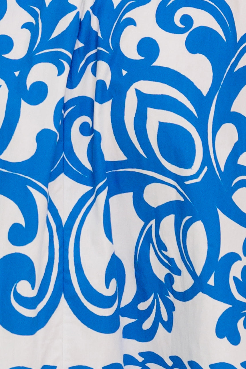 A printed woven midi dress featuring off shoulder neckline with flounce, ruffled hem and back zipper closure